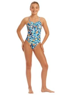 Be brave and free and wild as the sea in the magical Coral Camo design. Scattered with a coral sea dream in shades of blue, orange and white, whether high tide or low tide, this is the style to have on your side. Product Features: AMANZI Armor Chlorine Resistant Fabric 100% Polyester Lining White Coloured Lining Printed Back and Shoulder Straps Maximum 50+ UV Protection Bar Tack Reinforcement Medium Leg Height Placement Print