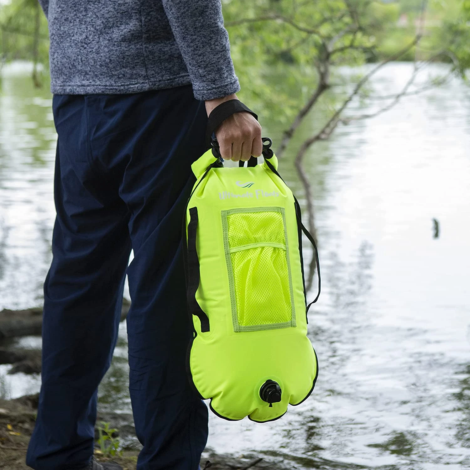 EXTERNAL POCKET – Big enough to carry water and snacks for your longer swims and your phone for easy access in case of emergency, or for that selfie opportunity! – The mesh pocket is strong, durable and the same colour as the tow float, so keeps the buoy very visible (unlike black pockets).